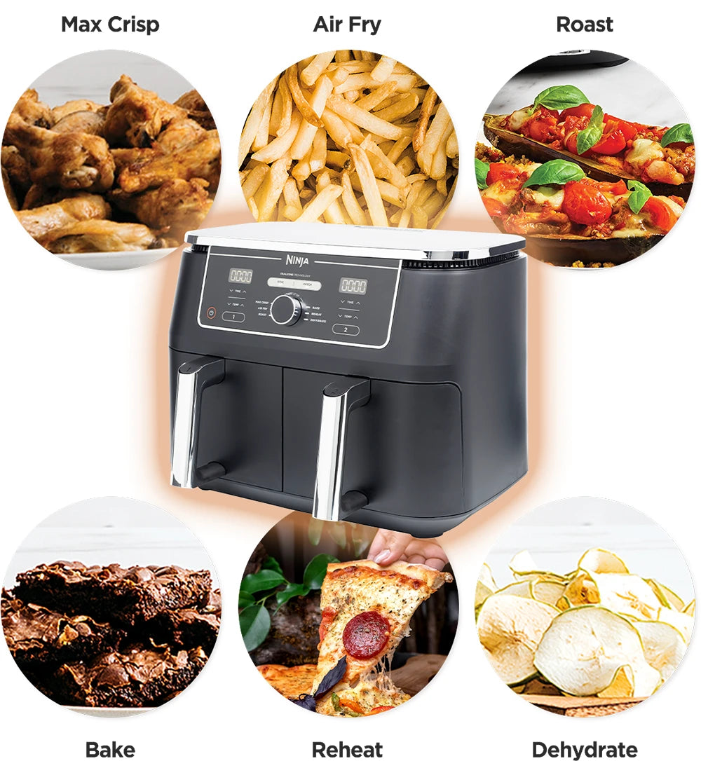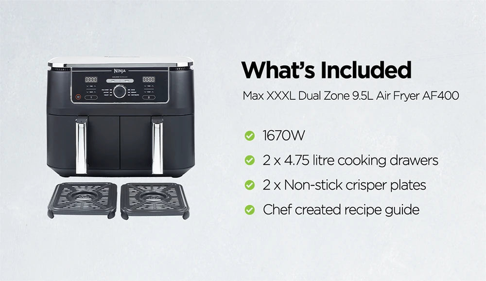Take mealtimes to the MAX with the Ninja Foodi Max XXXL Dual Zone 9.5 Litre Air Fryer. This large capacity air fryer has two XXXL independent drawers that lets you cook two foods at once, eliminating back-to-back cooking like a traditional single-drawer air fryer.