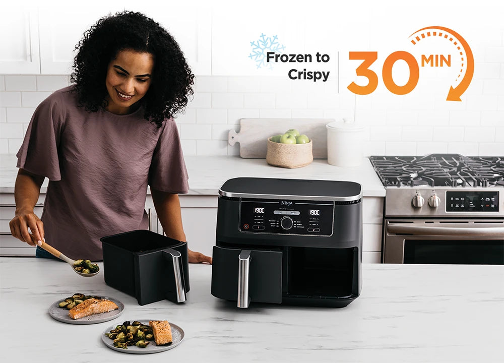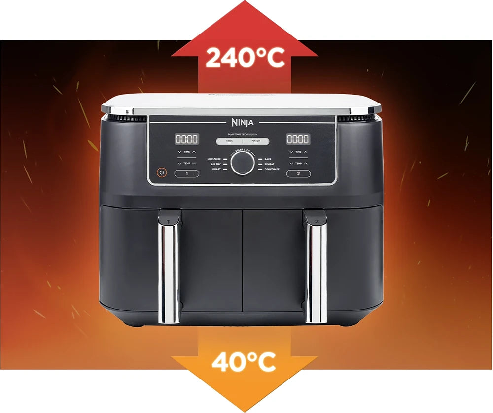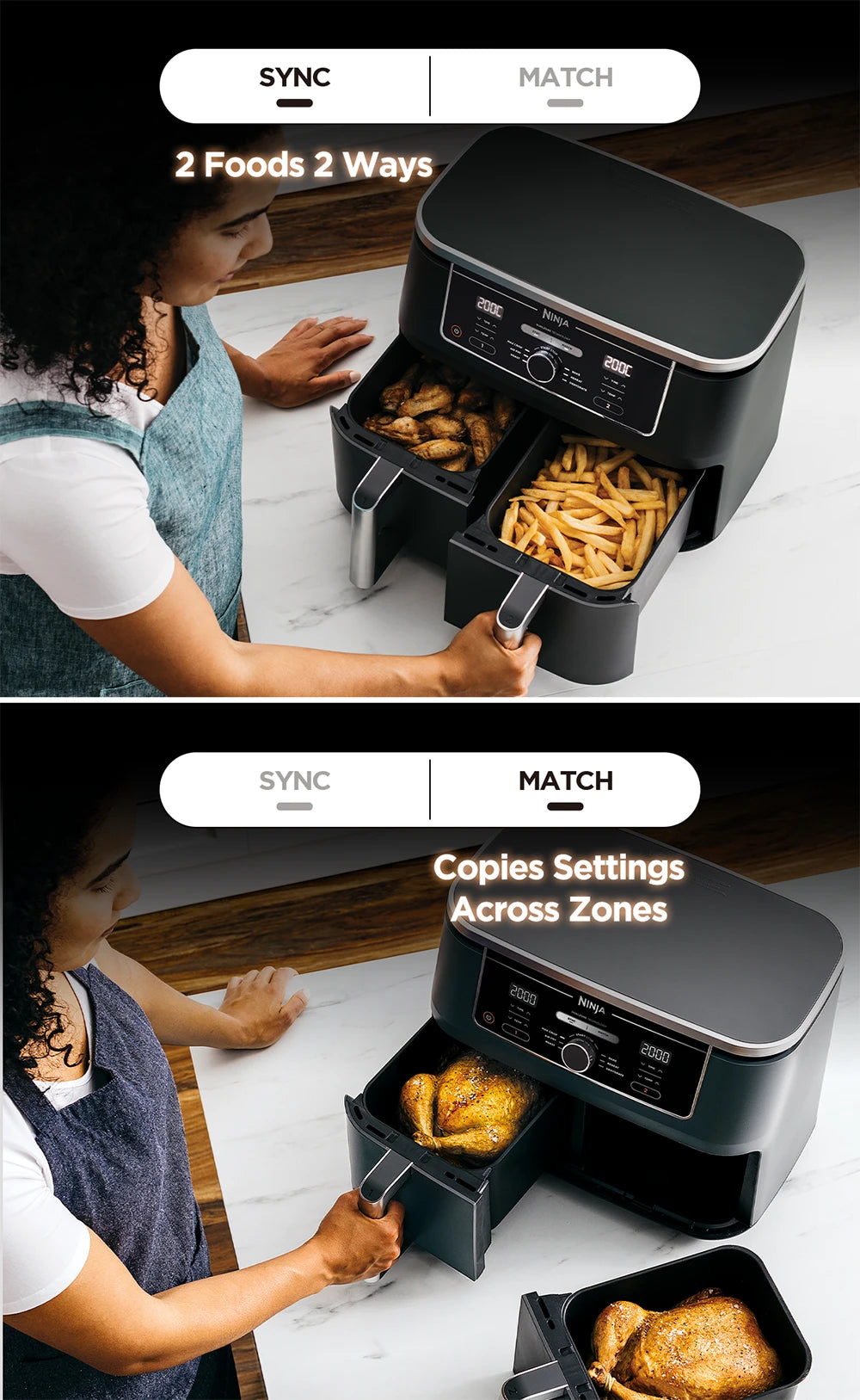 DualZone Technology allows you to choose between the Smart Finish feature, which unlocks cooking 2 foods 2 ways that finish at the same time, and the Match Cook feature, which easily copies settings across zones for full 9.5 litre capacity meals.