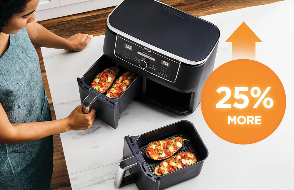 Cook up to 25% more* with the XXXL 9.5 litre capacity and two drawers. You can whip up a main and a side at the same time for quick large family meals or cook up to 2.8 kg’s of chips with ease.