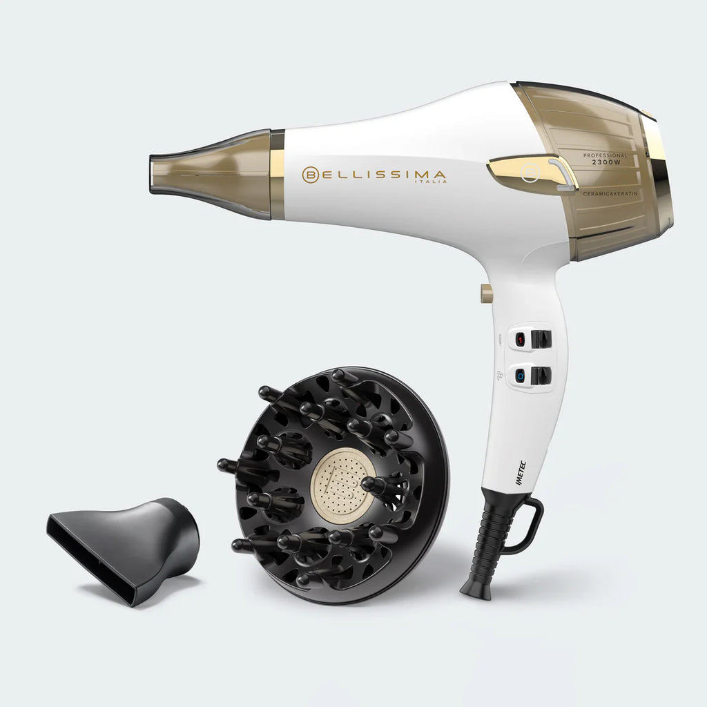 - Professional diffuser with a central ceramic and keratin element to add elasticity to curls - Beauty bag: to store your hairdryer and accessories and take them with you