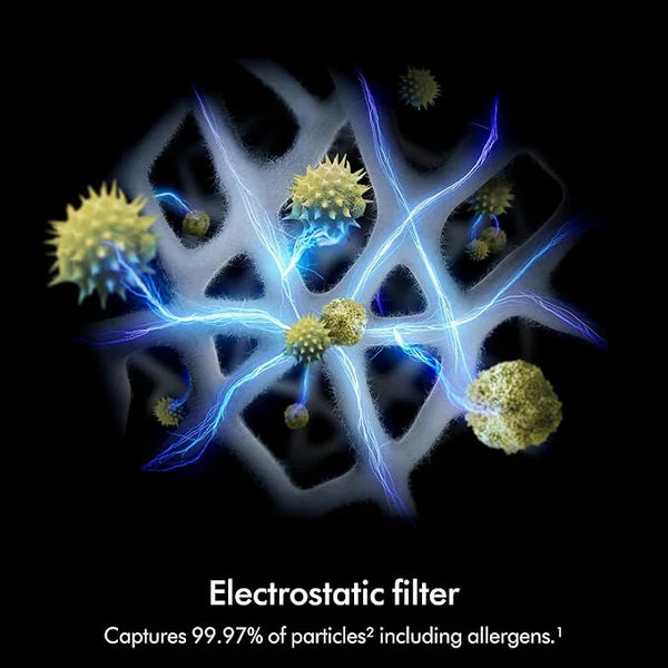 • The 360° Electrostatic filter captures 99.97% of pollutants as small as 0.3 microns. Lasts up to five years, reducing filter replacement hassle and costs.