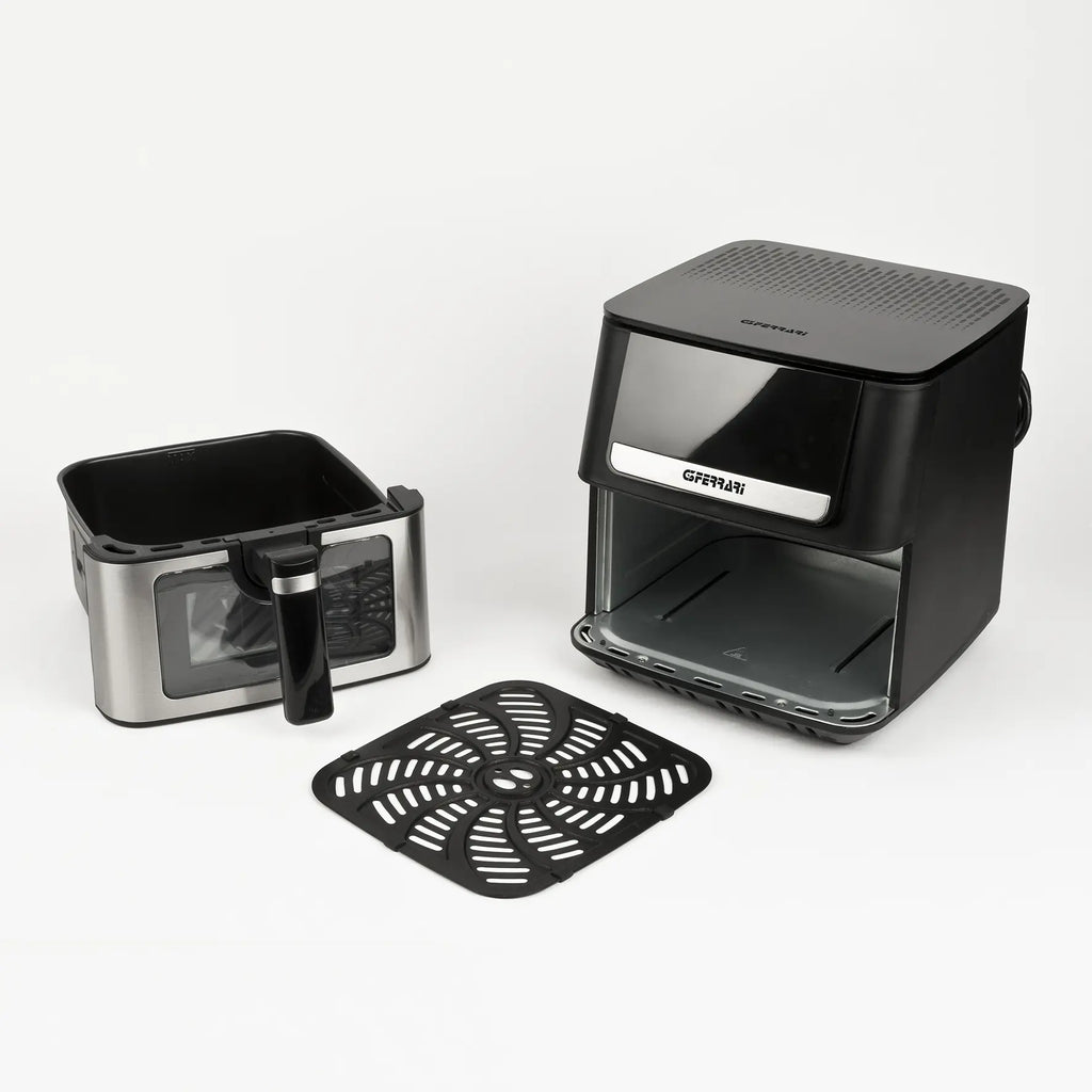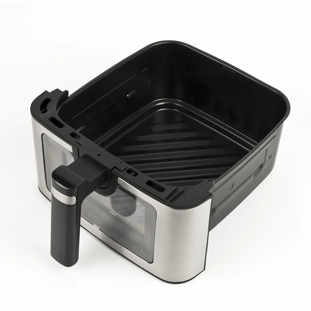 Container with wide surface 23x25cm, to place more food without stacking it Non-stick material BPA/PFOA safe. Metal inner cavityTray can be lifted up for more crispy cooking