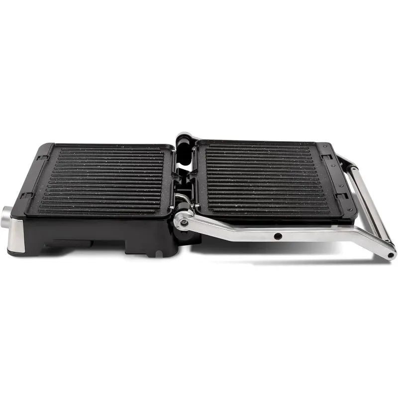 G3Ferrari contact grill: power 2200w, nonstick stone-like cooking plates, wide anti burn handle, removable plates for easy cleaning, oil dripping container, 2 lights for operation and temperature, stainless steel housing, plates dimensions 29×23 cm with 180 degrees book opening, adjustable temperature